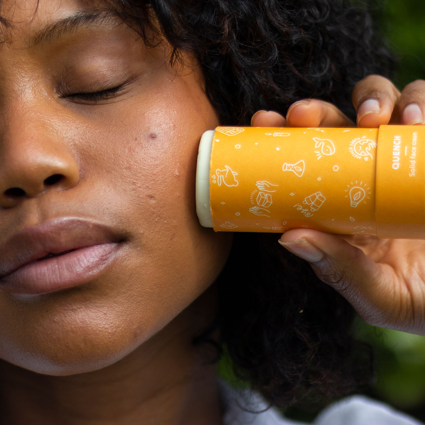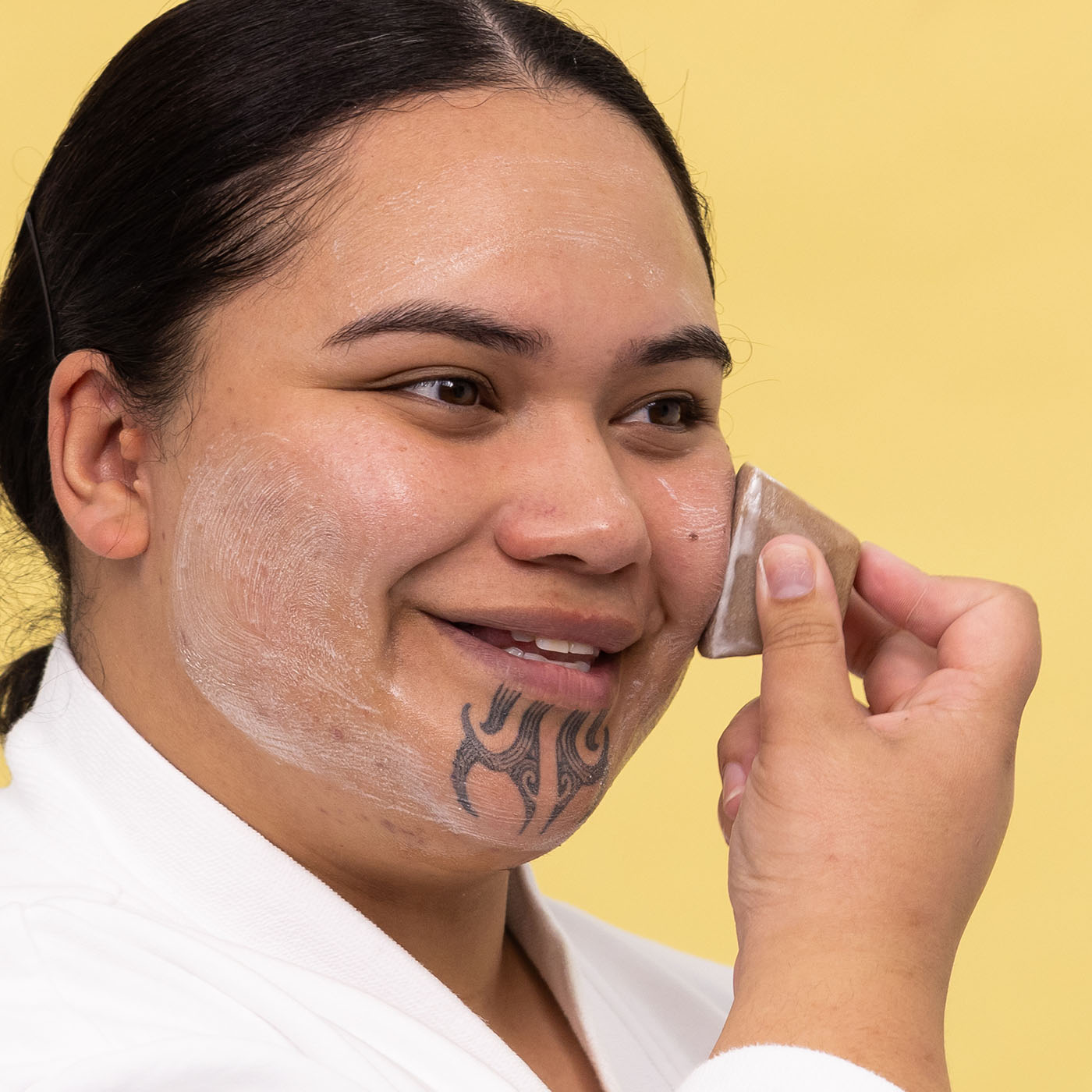 Wet both your face and the bar with warm water. Now you’ve got options. Option 1: Glide the bar directly on your face to create a creamy lather, massage into your skin, then rinse. Option 2: Rub the bar between your hands, create that rich lather, apply to your face and massage, then rinse. Either way, your skin will be refreshed without the plastic waste.