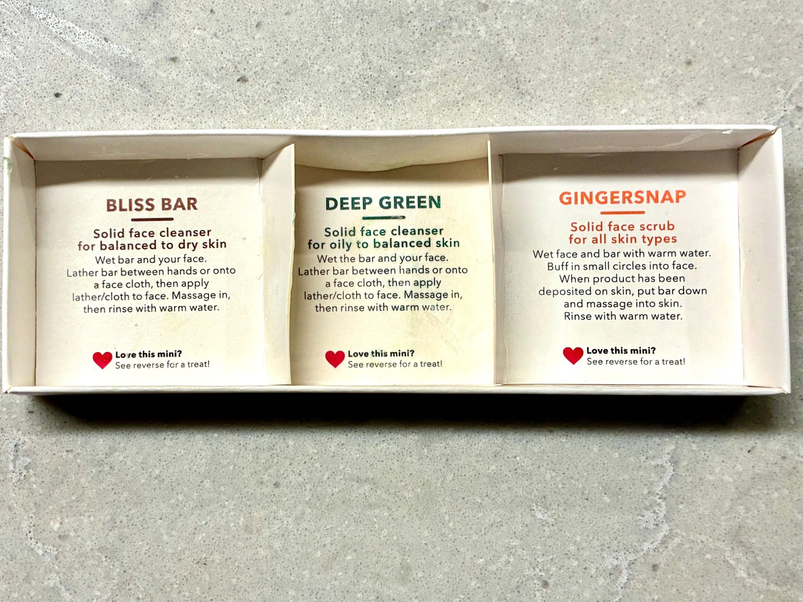 Bliss Bar™ Gentle Solid Face Cleanser: Sodium cocoyl isethionate, stearic acid, cocoyl methyl glucamide, Cocos nucifera (coconut) fruit, brassica alcohol, kaolin, glycerin, maltodextrin, sodium isethionate, Cocos nucifera (coconut) fruit powder, benzyl alcohol, Cyamopsis tetragonoloba (guar) gum, dehydroacetic acid, aqua (water).